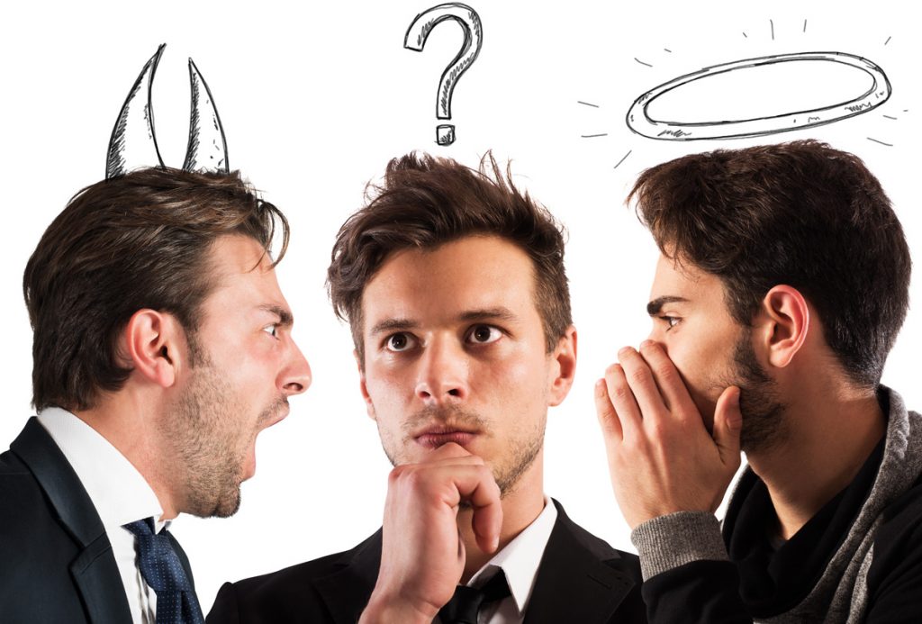 Cuando estaba pequeño amaba las caricaturas o dibujos animados, en estos había una escena muy recurrente, una situación específica en el cual cierto personaje deliberaba que hacer y en cada hombro se dibujaba un pequeño personaje ambos con personalidades, apariencia incluso coloración diferente, regularmente vestido uno como un pequeño angelito y una especie de demonio con un tridente y toda la parafernalia del caso, con el único propósito de dar a entender que uno daría un buen consejo y otro sería una mala influencia, en dicha caricatura sí el personaje hacia caso al ”bueno” o el “malo”, la repercusión de sus acciones era evidente al final del episodio.